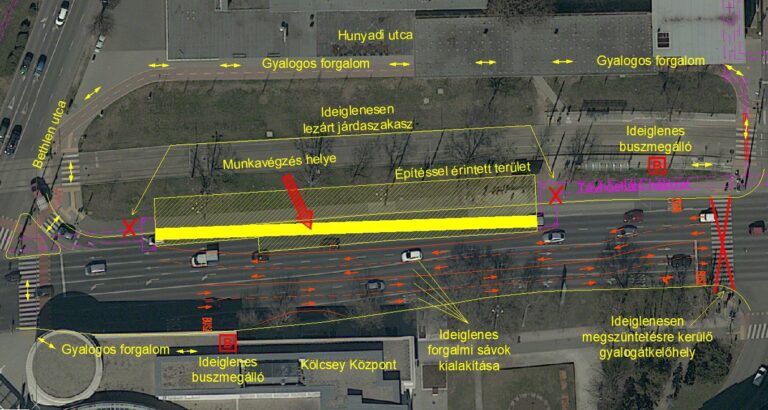 A Hunyadi utca érintett szakaszán a 2×3 sávos kétirányú forgalom a munkálatok idejére leszűkül 2×2 sávos kétirányú forgalomra. Szintén a munkálatok idején a Kölcsey Központ oldalában lévő buszmegállóhely 13 méterrel áthelyezésre kerül a Darabos u. irányába. Az északi oldalon lévő buszmegállóhely szintén áthelyezésre kerül a Darabos u. irányába 33 méterrel. Ezen áthelyezéshez kapcsolódóan pedig a Hunyadi utcán lévő kijelölt gyalogosátkelőhely ideiglenes megszüntetésre kerül.